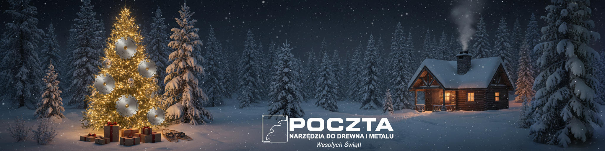 Pionowa kartka świąteczna w wysokiej jakości do druku. Zimowy las nocą, śnieg, choinki. Na pierwszym planie choinka, na której zamiast bombek wiszą piły tarczowe – metalowe, z wyraźnie widocznymi zębami z węglika spiekanego, lekko połyskujące. W oddali mała drewniana chatka z kominem, z którego unosi się delikatny dym. Wieczorowa pora, bezchmurne granatowe niebo z jedną jasną Gwiazdą Betlejemską. Klimat spokojny, profesjonalny, świąteczny. Na dole kartki elegancki tekst po polsku: „Szanowni Państwo, z okazji Świąt Bożego Narodzenia składamy najserdeczniejsze życzenia spokoju, radości oraz chwil pełnych ciepła spędzonych w gronie najbliższych. W nadchodzącym Nowym Roku życzymy zdrowia, pomyślności oraz wielu sukcesów – zarówno w życiu zawodowym, jak i osobistym. Życzy FIRMA POCZTA” Logo „POCZTA – Narzędzia do drewna i metalu / Serwis Narzędzi” umieszczone u dołu kartki, czarno-białe, kontrastowe. Styl realistyczno-ilustracyjny, premium.